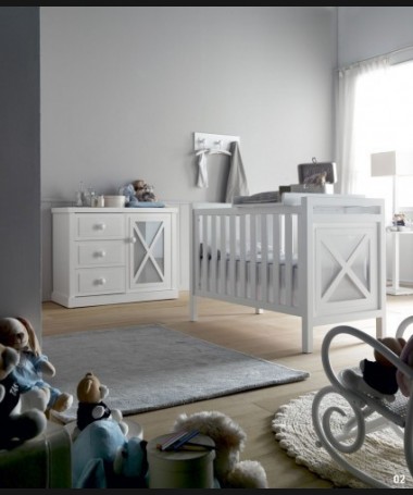 - Dormitorio de bebé modelo PDB0003, de estilo clásico hecho a medida, lacado en blanco mate, compuesto por cuna, cómoda y perchero a juego