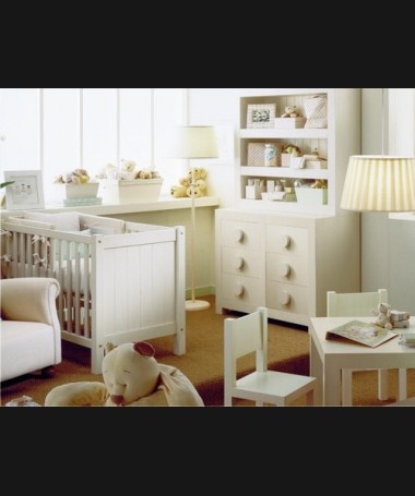 - Dormitorio de bebé modelo PDB0006, de estilo moderno hecho a medida, lacado en blanco roto, compuesto por cuna, mueble con estantería abierta y cerrada, mesa y dos sillitas a juego