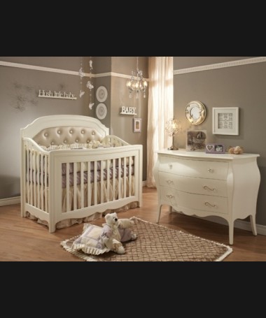 - Dormitorio de bebé modelo PDB0009, de estilo clásico hecho a medida, en lacado blanco roto, compuesto por cuna con el fonfo tapizado en capitoné, y cómoda a juego