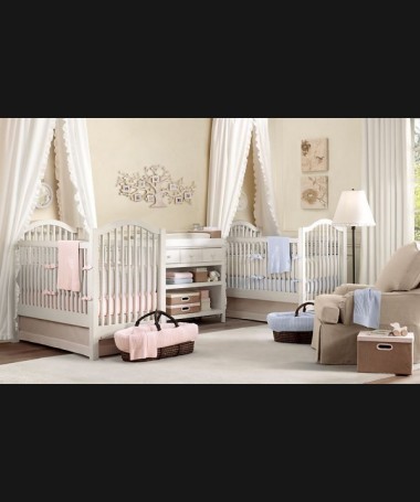 - Dormitorio de bebé modelo PDB0013, de estilo clásico hecho a medida, lacado en blanco y marrón mate, compuesto por dos cunas, cómoda con cambiador a juego