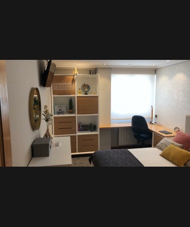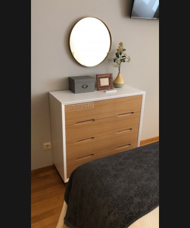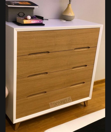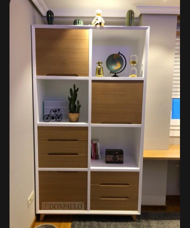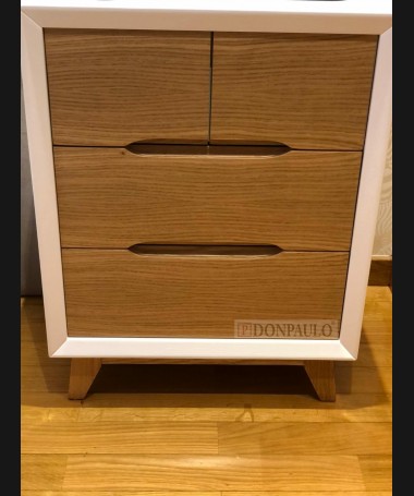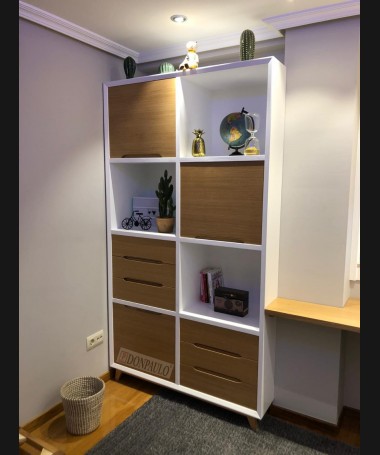 - Dormitorio juvenil modelo TDJ0016, de estilo moderno hecho a medida, en DM hidrófugo lacado en blanco mate con los frentes y las patas en roble color natural. Compuesto por cama, con canapé, 1 mesita, cómoda, escritorio con cajonera y librería a juego