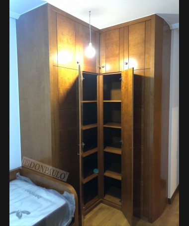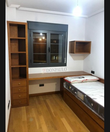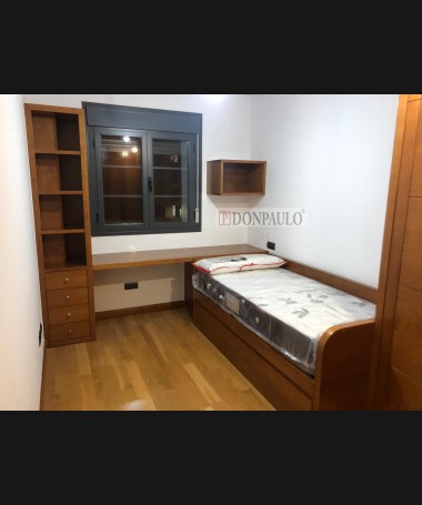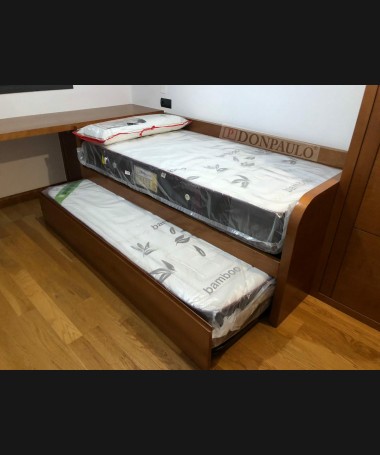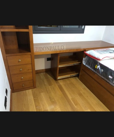 - Dormitorio juvenil modelo TDJ0018, de estilo clásico hecho a medida, en madera de castaño. Compuesto por cama nido, escritorio con librería y armario en "L" a juego