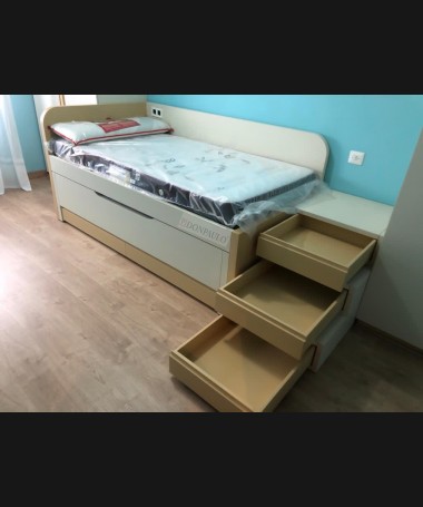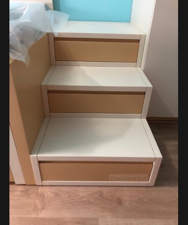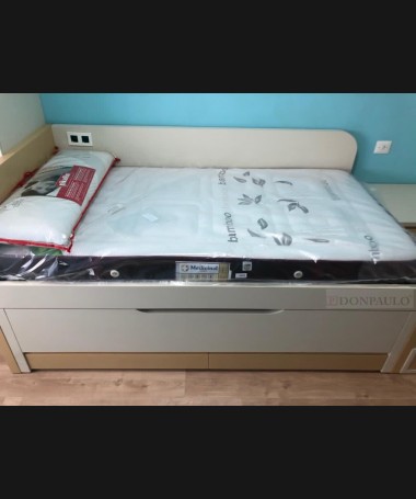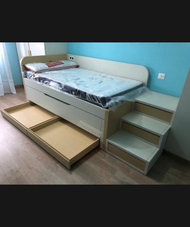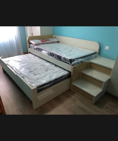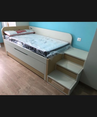 - Dormitorio juvenil modelo TDJ0019, de estilo moderno hecho a medida, compuesto por cama compacta, con dos colchones y dos cajones en la parte de abajo y escalera de cajones. En madera en acabado decapado beige y avellana