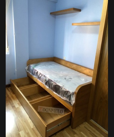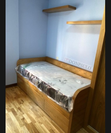 - Dormitorio juvenil modelo TDJ0021, de estilo clásico hecho a medida, en madera de castaño, compuesto por cama nido, baldas y armario a juego