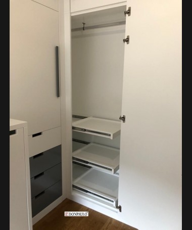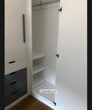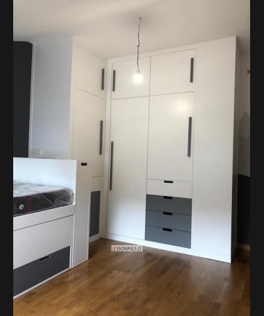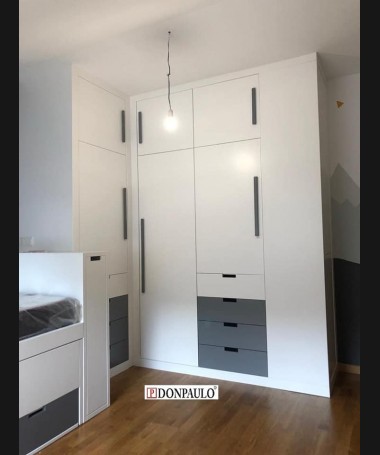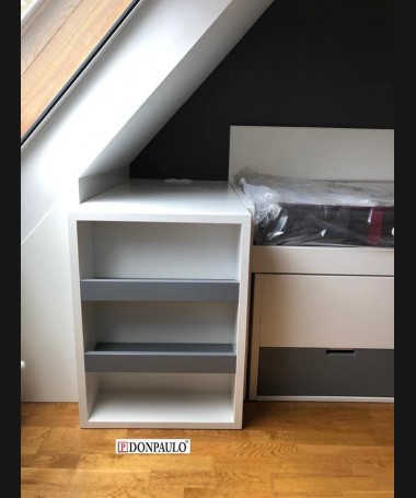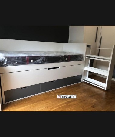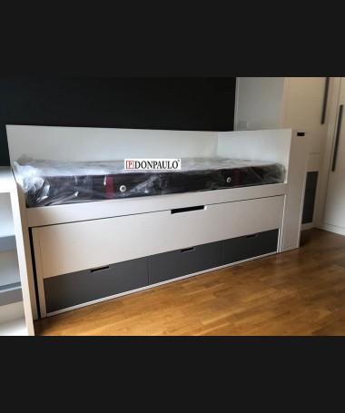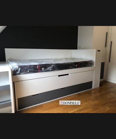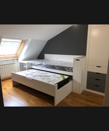 - Dormitorio juvenil modelo TDJ0022, de estilo moderno hecho a medida, en lacado blanco mate con detalles gris antracita. Compuesto por cama compacta con dos colchones y cajones debajo, escritorio extraíble, módulo extraíble al pie de la cama, y armario a juego