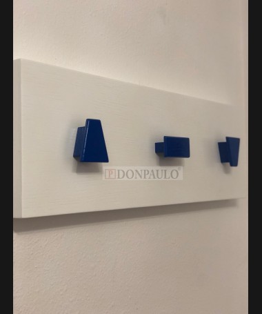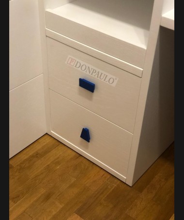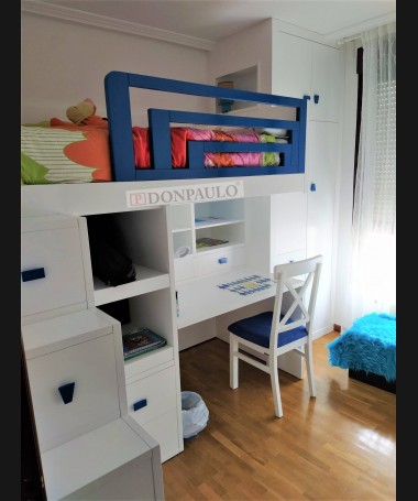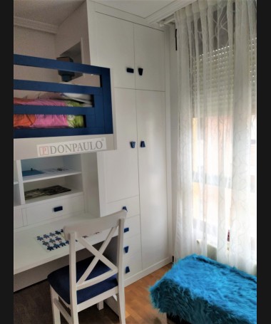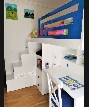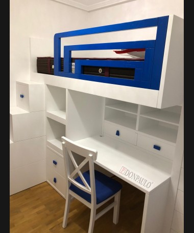 - Dormitorio juvenil modelo TDJ0025, de estilo moderno hecho a medida, en madera en acabado decapado blanco con detalles azules. Compuesto por cama tipo tren, con escaleras de cajones, escritorio con cajonera y librería debajo de la cama, silla, dos armarios y un perchero