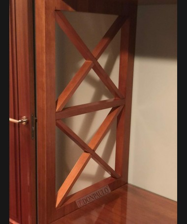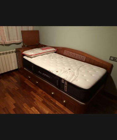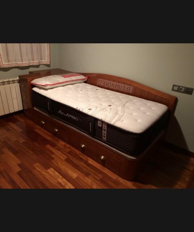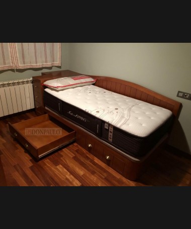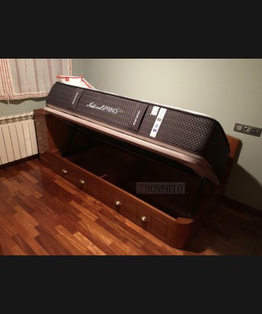 - Dormitorio juvenil modelo TDJ0027, de estilo clásico hecho a medida, en madera de castaño, compuesto por cama con canapé elevable y cajones debajo, arcón en el cabecero de la cama, y escritorio con librería a juego