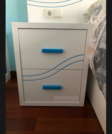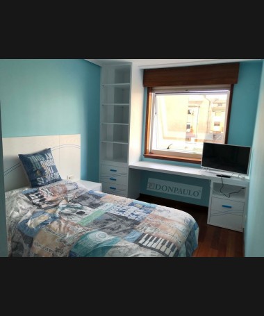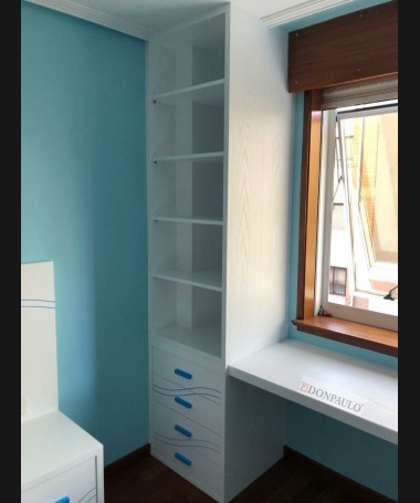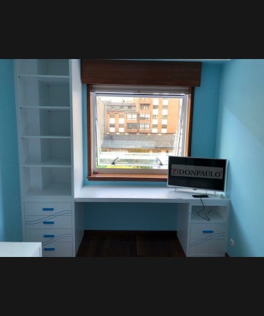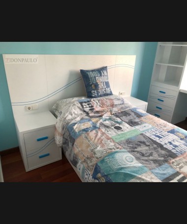 - Dormitorio juvenil modelo TDJ0029, de estilo moderno hecho a medida, en madera en acabado decapado blanco con los detalles en azul. Compuesto por cama con canapé elevable, una mesita, escritorio con librería y armario a juego