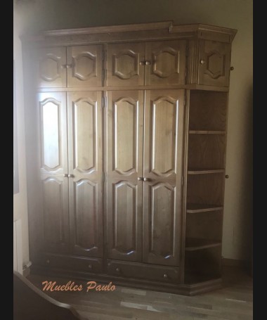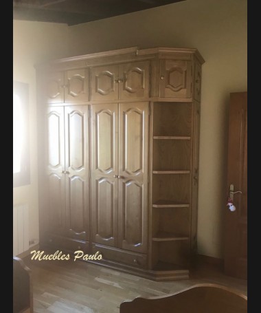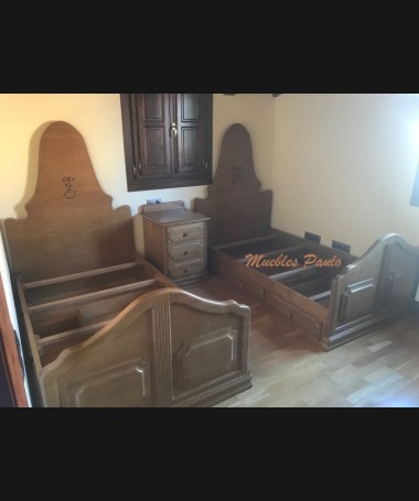 - Dormitorio juvenil modelo TDJ0035, de estilo clásico hecho a medida, compuesto de dos camas, una mesita y armario a juego, en madera de castaño tallada