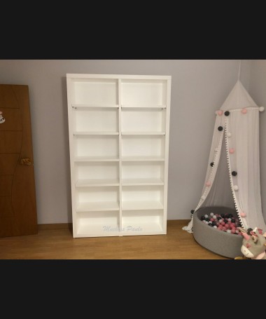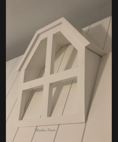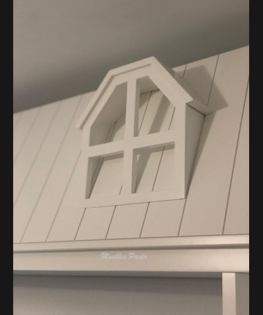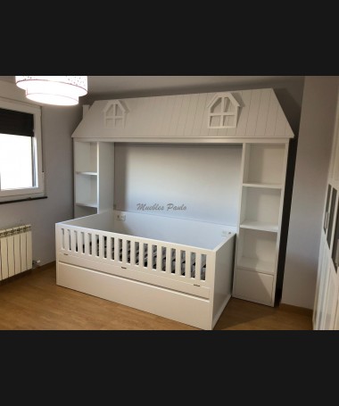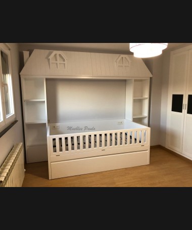 - Dormitorio juvenil modelo TDJ0042, en madera en acabado decape blanco, compuesto por cama nido en forma de casa con barrera, y librerías a los lados, armario, y librería a juego