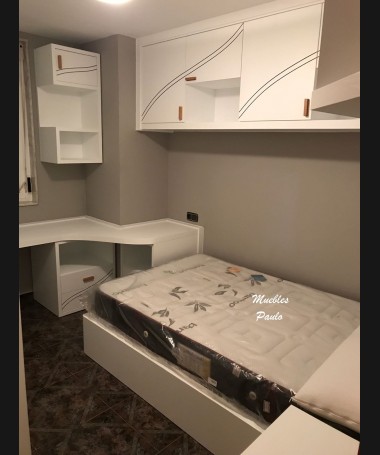 - Dormitorio juvenil modelo TDJ0046, de estilo moderno hecho a medida, en madera en acabado decapado blanco, con detalles color madera; compuesto por cama con puente, escritorio, librería y armario a juego