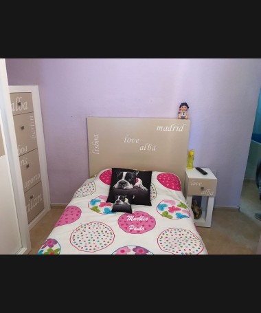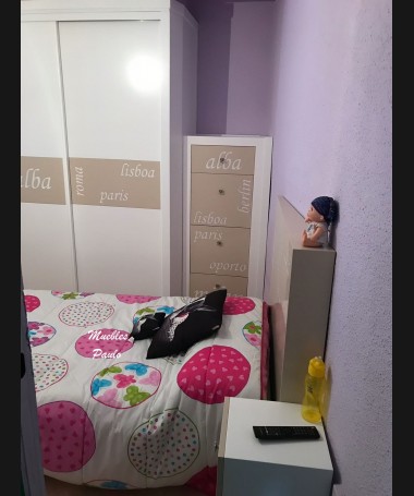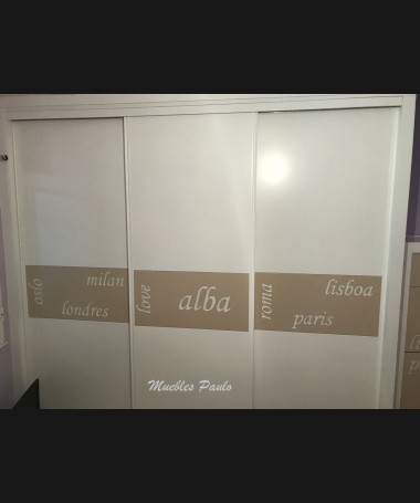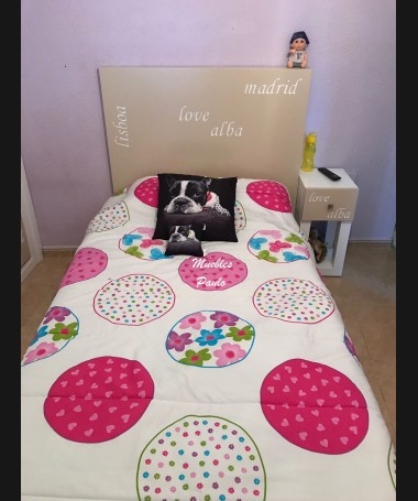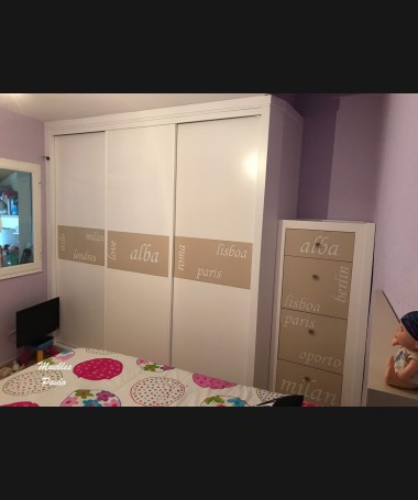 - Dormitorio juvenil modelo TDJ0048, de estilo moderno hecho a medida, en lacado blanco y camel mate, con letras talladas. Compuesto por: Cama, una mesita, zapatero y armario a juego
