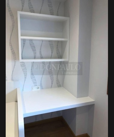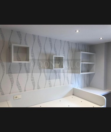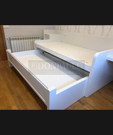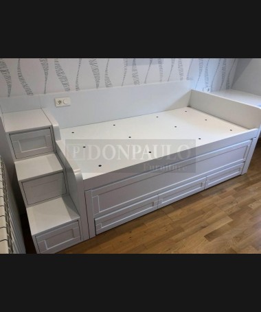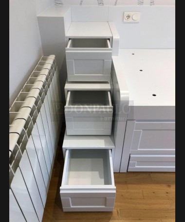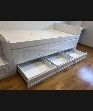 - Dormitorio juvenil modelo TDJ0049, de estilo moderno hecho a medida, en madera de castaño en acabado decapado blanco. Compuesto por cama compacta, escalera de cajones, escritorio con librería y armario a juego