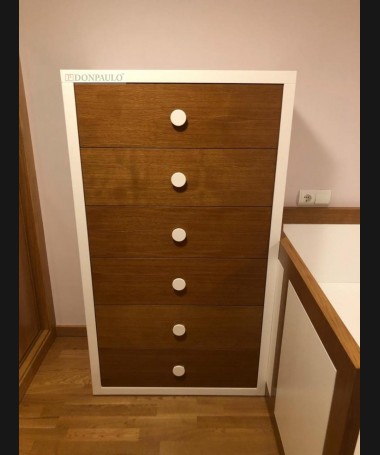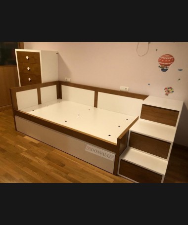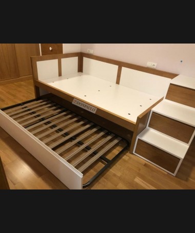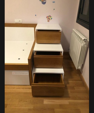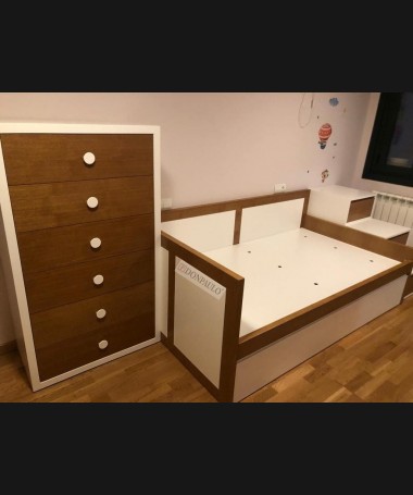 - Dormitorio juvenil modelo TDJ0050, de estilo modero hecho a medida, en madera de castaño en color AM y decapado blanco. Compuesto por cama nido, sinfonier y escalera de cajones