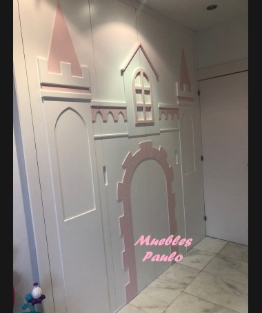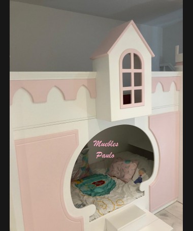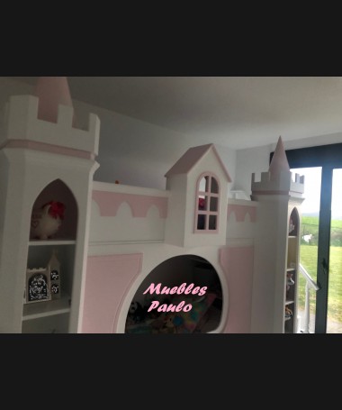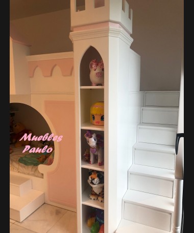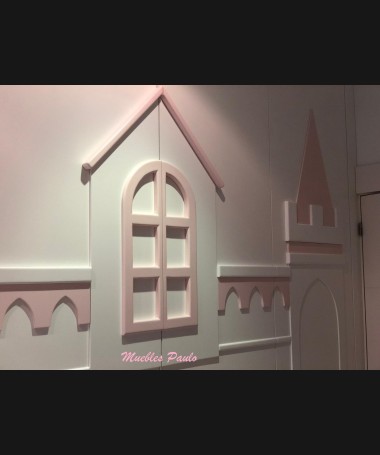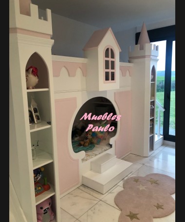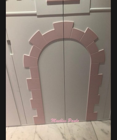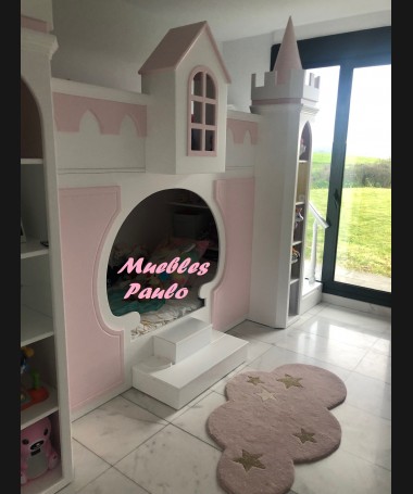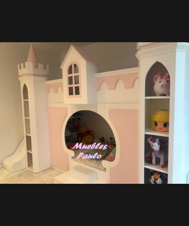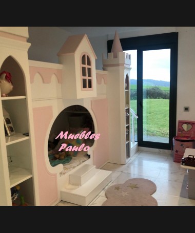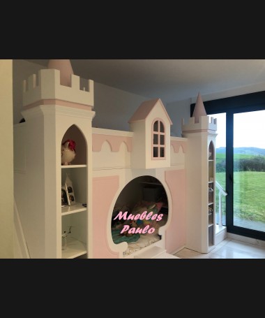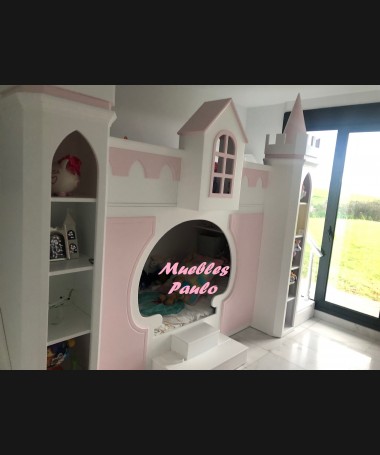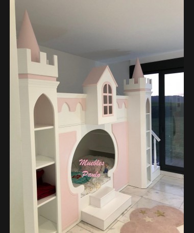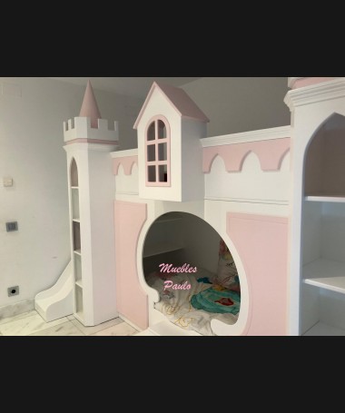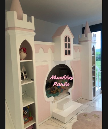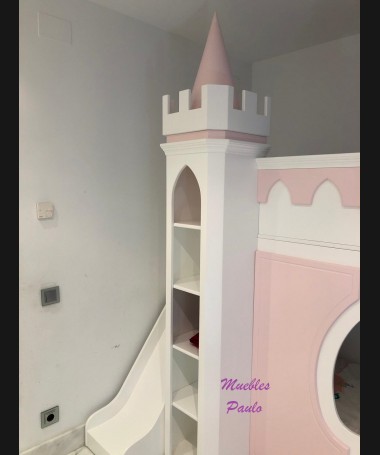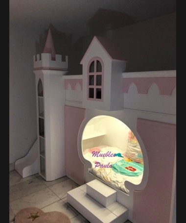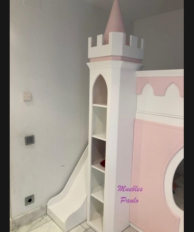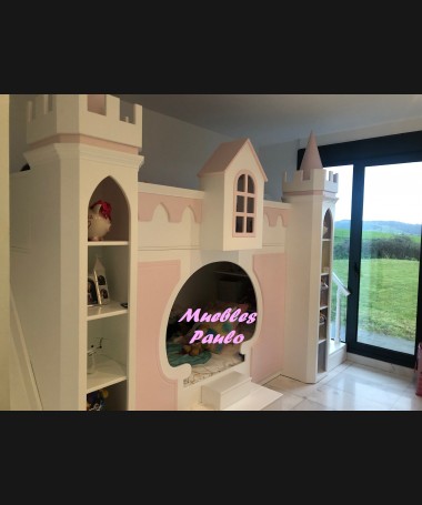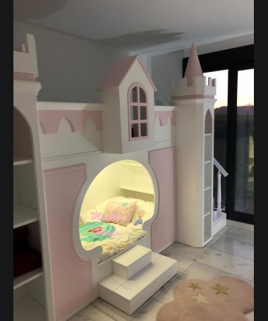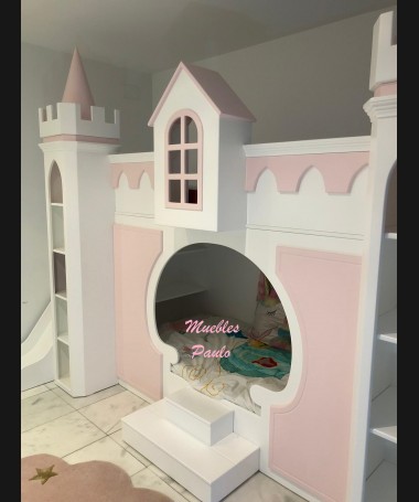 - Dormitorio castillo con armario modelo TDJ0001, hecho a medida en DM Hidrófugo lacado en blanco mate con detalles en color rosa, con estanterías interiores, cama arriba y cama abajo, luces led en el interior, escaleras con cajón incorporado, tobogán lateral; con armario hecho a juego