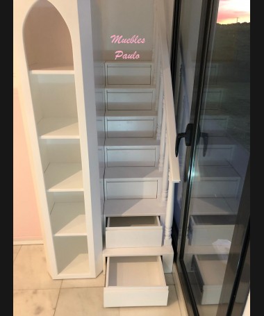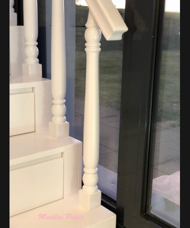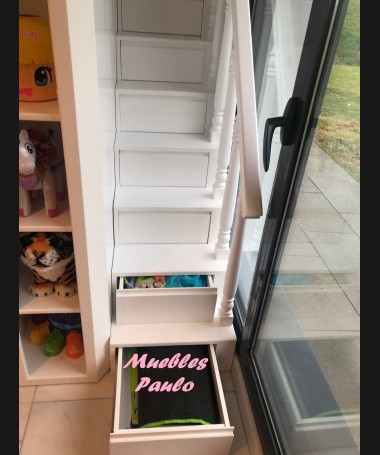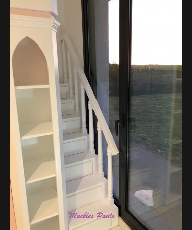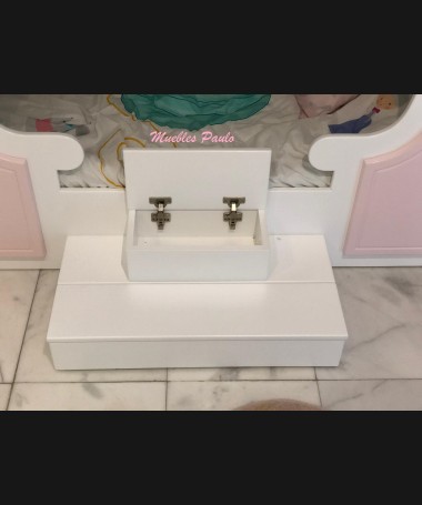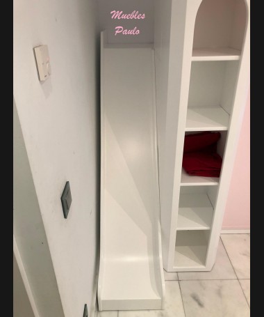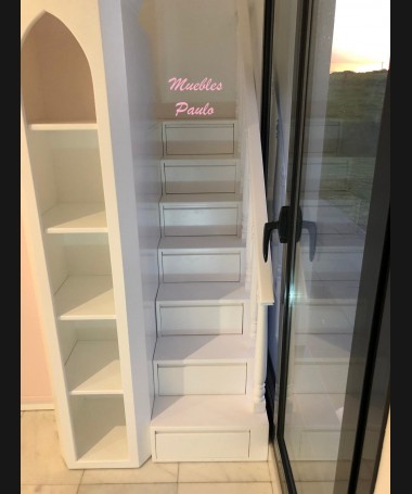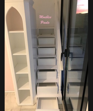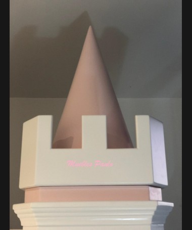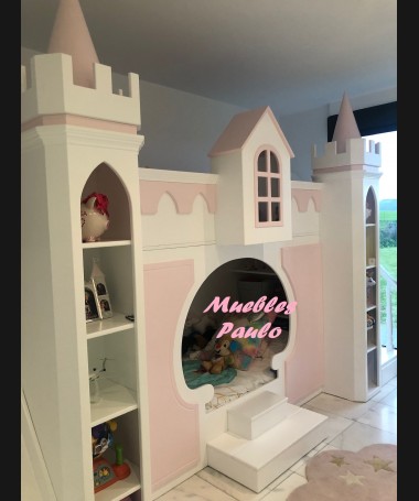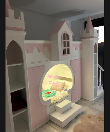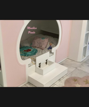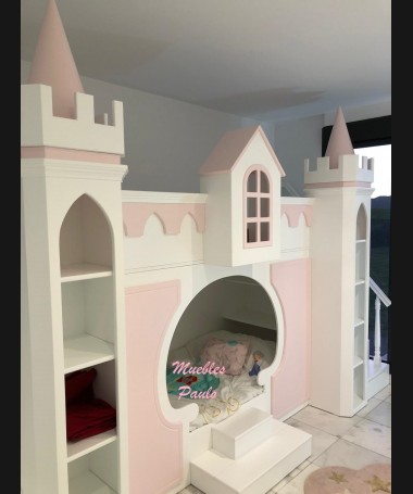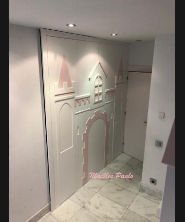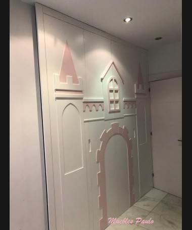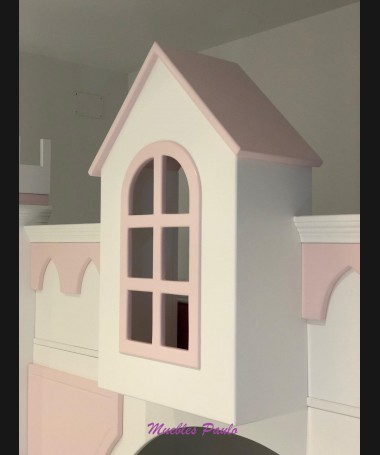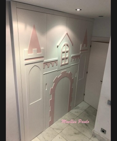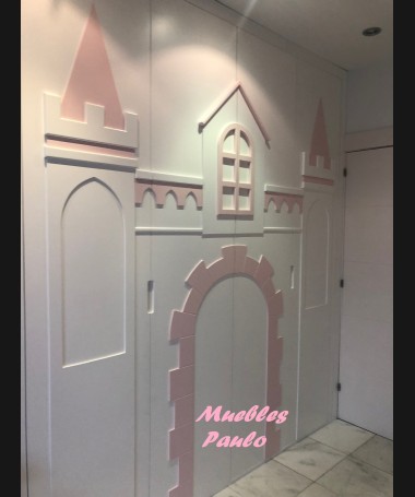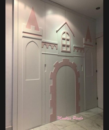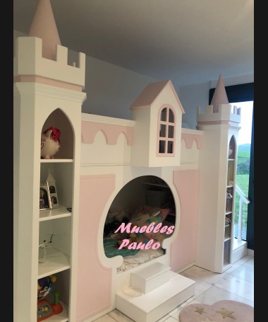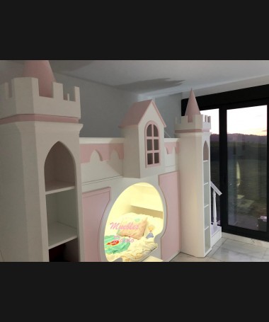 - Dormitorio castillo con armario modelo TDJ0001, hecho a medida en DM Hidrófugo lacado en blanco mate con detalles en color rosa, con estanterías interiores, cama arriba y cama abajo, luces led en el interior, escaleras con cajón incorporado, tobogán lateral; con armario hecho a juego