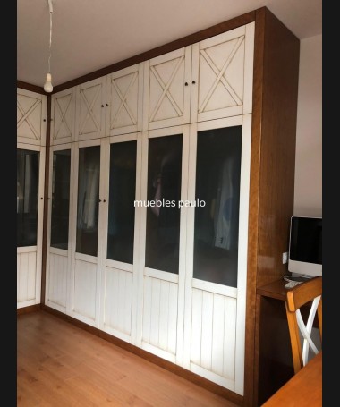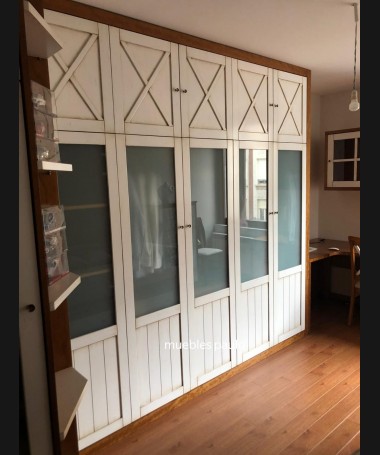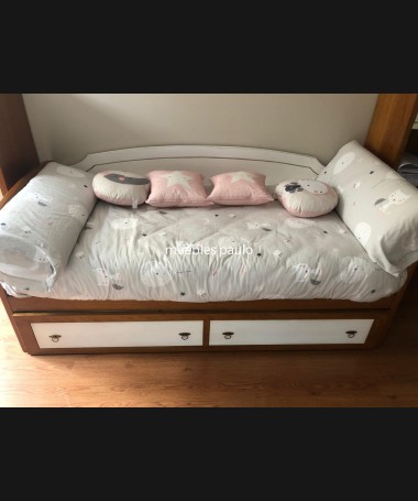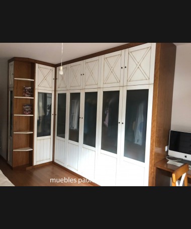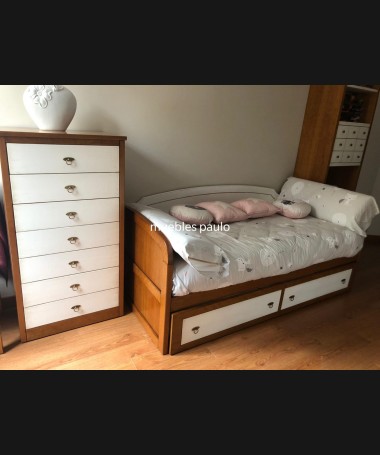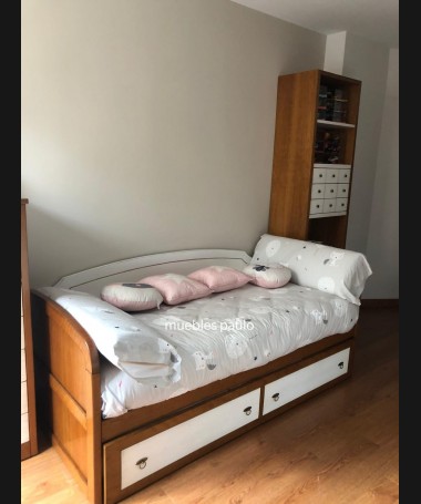 - Dormitorio juvenil modelo TDJ0008, con armario a juego, hecho a medida, de estilo clásico en madera, compuesto por: cama nido, escritorio con librería, estantería, muebles auxiliares, silla para mesa de estudio y armario en L a medida con el interior personalizado