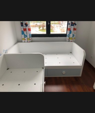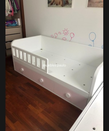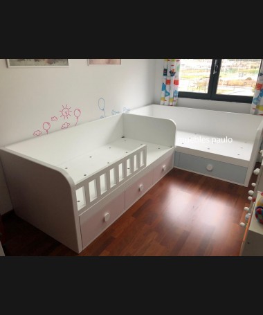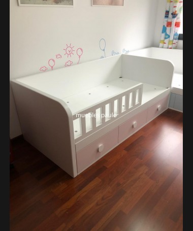 - Dormitorio juvenil modelo TDJ0012, hecho a medida con dos camas nido, en acabado blanco con detalles en rosa y azul