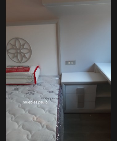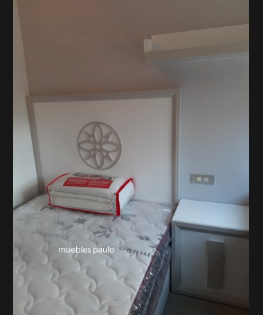- Dormitorio juvenil modelo TDJ0014, en madera en acabado decapé blanco con detalles en decape gris, compuesto por: cama de 135 cm con canapé elevable, mesita, escritorio con librería, silla, espejo y armario a juego