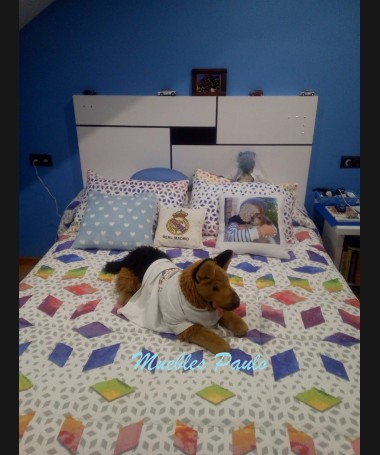 - Cama modelo TDJ0015, hecha a medida de estilo juvenil, en madera, en acabado decapado blanco con los detalles en negro y luces led incorporadas