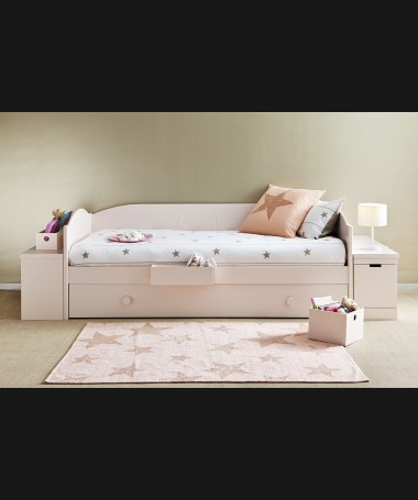 - Dormitorio juvenil modelo PDJ0022, de estilo moderno hecho a medida, en DM hidrófugo lacado en beige mate. Compuesto por cama nido, con dos muebles auxiliares a los lados
