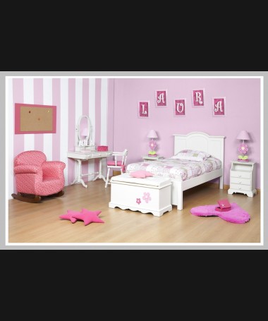- Dormitorio juvenil modelo PDJ0023, de estilo clásico hecho a medida, en dm hidrófugo lacado en blanco mate. Compuesto por cama, dos mesitas, baúl, tocador y silla a juego