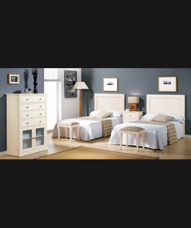 - Dormitorio juvenil modelo PDJ0025, de estilo clásico hecho a medida, en madera de castaño en acabado decapado blanco envejecido. Compuesto por dos camas, una mesita, dos banquetas descalzadoras, y un sinfonier