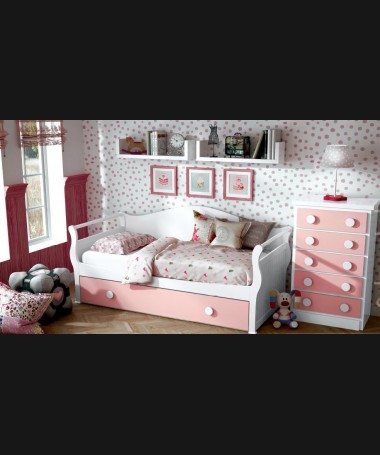 - Dormitorio juvenil modelo PDJ0032, de estilo moderno hecho a medida, lacado en blanco y rosa. Compuesto por cama nido, estanterías y sinfonier a juego