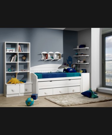 - Dormitorio juvenil modelo PDJ0034, de estilo moderno hecho a medida, lacado en blanco mate. Compuesto por cama compacta, mueble extraíble, estanterías y librería a juego