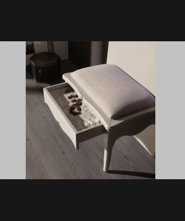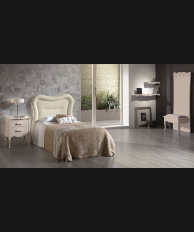 - Dormitorio juvenil modelo PDJ0037, de estilo clásico hecho a medida, en DM hidrófugo lacado en beige mate. Compuesto por cama con cabecero tapizado, una mesita, estanterías, y descalzadora con perchero y cajón a juego