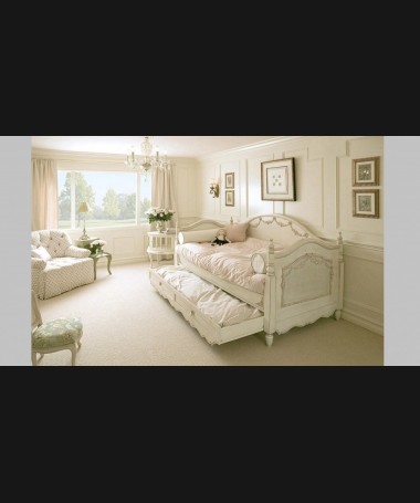 - Dormitorio juvenil modelo PDJ0039, de estilo clásico hecho a medida, en acabado lacado blanco roto envejecido. Compuesto por cama nido, silla y mesas auxiliares a juego