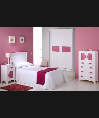 - Dormitorio juvenil modelo PDJ0042, de estilo moderno hecho a medida, en acabado lacado blanco y rosa. Compuesto por cama, una mesita, sinfonier y espejo a juego