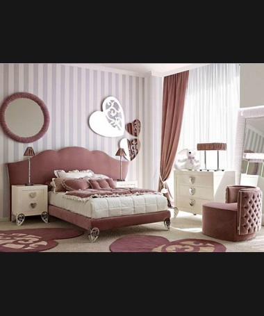 - Dormitorio juvenil modelo PDJ0045, de estilo clásico hecho a medida. Compuesto por cama con cabecero corrido tapizada, una mesita, cómoda, sillón y espejo a juego