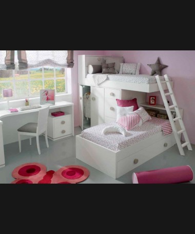 - Dormitorio juvenil modelo PDJ0046, de estilo moderno hecho a medida, lacado en blanco mate con detalles en gris. Compuesto por cama tipo tren, escalera, armario debajo, mesa de estudio a juego y silla