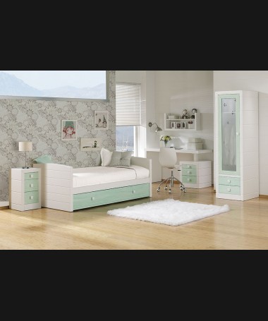 - Dormitorio juvenil modelo PDJ0048, de estilo moderno hecho a medida, de estilo moderno hecho a medida, lacado en blanco y verde mate. Compuesto por cama nido, mesita, mesa de estudio, estanterías y armario a juego