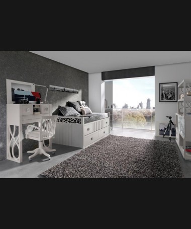 - Dormitorio juvenil modelo PDJ0002, de estilo moderno hecho a medida, lacado en blanco roto, compuesto por, cama nido, escritorio con librería y mueble estantería a juego