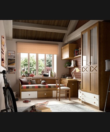 - Dormitorio juvenil modelo PDJ0003, de estilo clásico hecho a medida, en madera, en acabado color madera con detalles color decape blanco, compuesto por cama nido, escritorio con estantería, silla y armario a juego