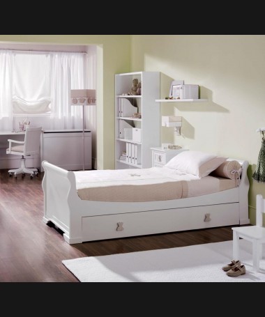 - Dormitorio juvenil modelo PDJ0006, de estilo moderno hecho a medida, lacado en blanco, compuesto por cama nido, escritorio con silla giratoria, mesita con estantería, y librería a juego