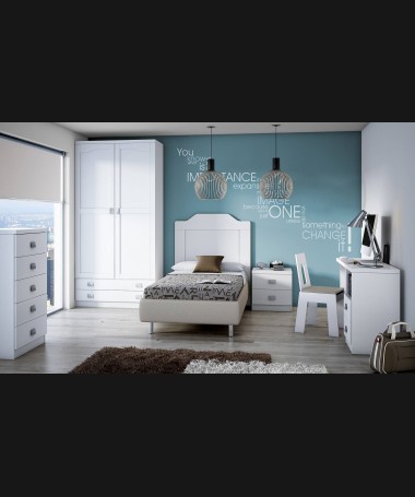 - Dormitorio juvenil modelo PDJ0008, de estilo moderno hecho a medida, lacado en blanco. Compuesto por: cama, sinfonier, mesita, armario, escritorio y silla a juego