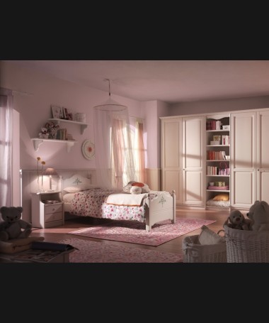 - Dormitorio juvenil modelo PDJ0011, de estilo clásico hecho a medida, lacado en blanco roto, y compuesto por, cama, mesita, estanterías y armario a juego