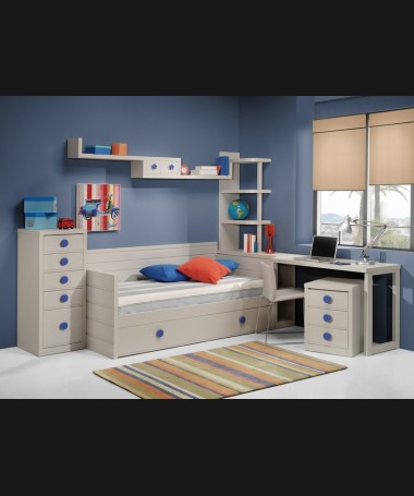 - Dormitorio juvenil modelo PDJ0012, de estilo moderno hecho a medida, lacado en gris y azul; y compuesto por cama nido, sinfonier, escritorio con estanterías a juego