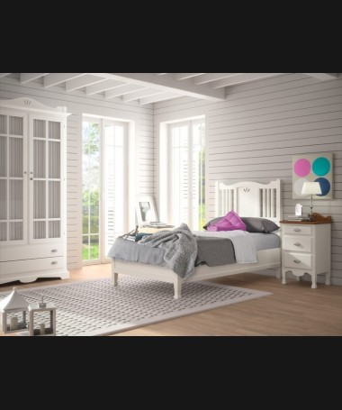 - Dormitorio juvenil modelo PDJ0015, de estilo clásico hecho a medida, lacado en blanco con la tapa de madera. Compuesto por cama, mesita y armario a juego