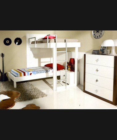 - Dormitorio juvenil modelo PDJ0016, de estilo moderno hecho a medida, lacado en blanco con detalles color madera; compuesto por: cama tipo tren, con escalera, con mesita y sinfonier a juego