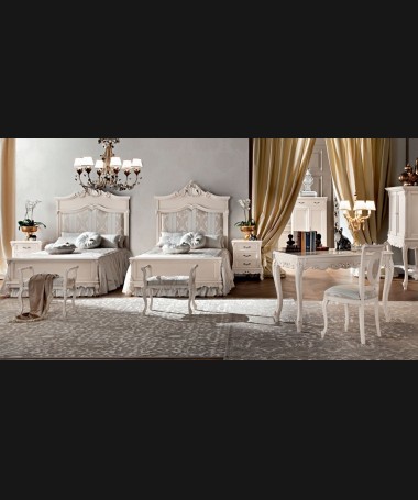 - Dormitorio juvenil modelo PDJ0017, de estilo clásico hecho a medida, en madera de cerezo en acabado blanco efecto anticuario. Compuesto por: dos camas, dos mesitas, dos banquetas descalzadoras, cómoda, sinfonier, mesa de estudio y silla a juego