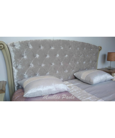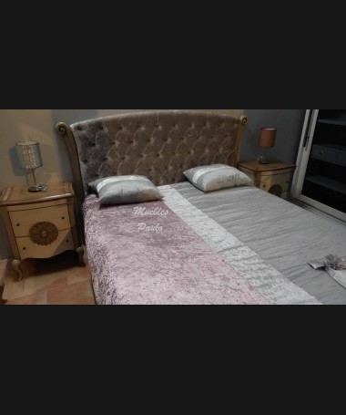 > Cama de matrimonio con cabecero tapizado en terciopelo, con detalles en capitoné, de L190 x F8 cm lo tapizado, F3,5 cm la madera, F210 x A125 cm (Para colchón de L160 x F200 cm)