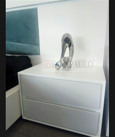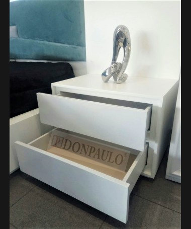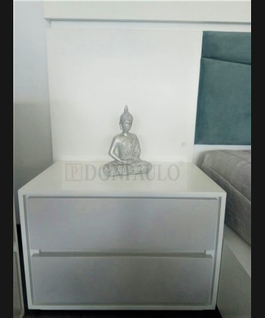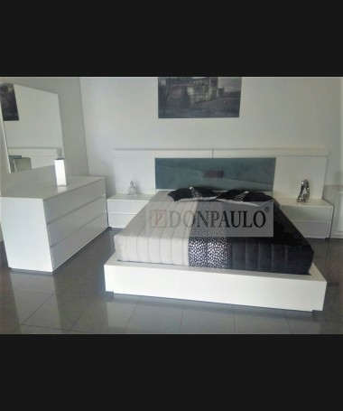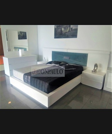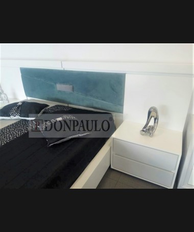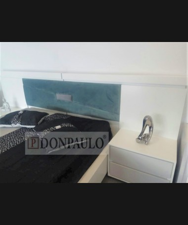 - Dormitorio modelo EDO0056, de estilo moderno hecho a medida, en madera en acabado decapado blanco, con cabecero tapizado en verde y gris, con leds, compuesto por: