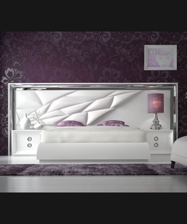 - Dormitorio modelo PDO0032, de estilo moderno hecho a medida, lacado en blanco mate, con detalles lacados en plata alto brillo y metálicos, compuesto por cabecero corrido y tapizado, bañera y dos mesitas