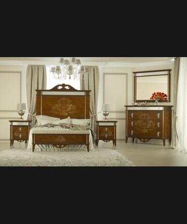 - Dormitorio modelo PDO0047, de estilo clásico hecho a medida, en madera de cerezo con detalles plateados. Compuesto por cama de matrimonio, dos mesitas, cómoda y espejo a juego