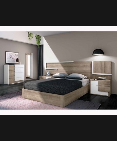 - Dormitorio modelo PDO0050, de estilo moderno hecho a medida, en madera y lacado en blanco mate. Compuesto por cama de matrimonio con cabecero corrido y canapé elevable, dos mesitas, y sinfonier con espejo a medida