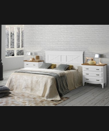 - Dormitorio modelo PDO0051, de estilo clásico hecho a medida, en lacado blanco mate con detalles color madera. Compuesto por cama de matrimonio, con dos mesitas a juego